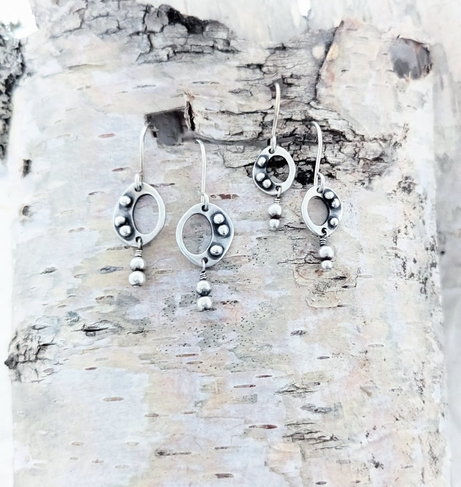 Pebbled Freeform Earrings in two sizes...Small and Mini for those who prefer a smaller earring. Great for daily wear! Earring is handmade in .999 fine silver with dangling sterling silver beads.