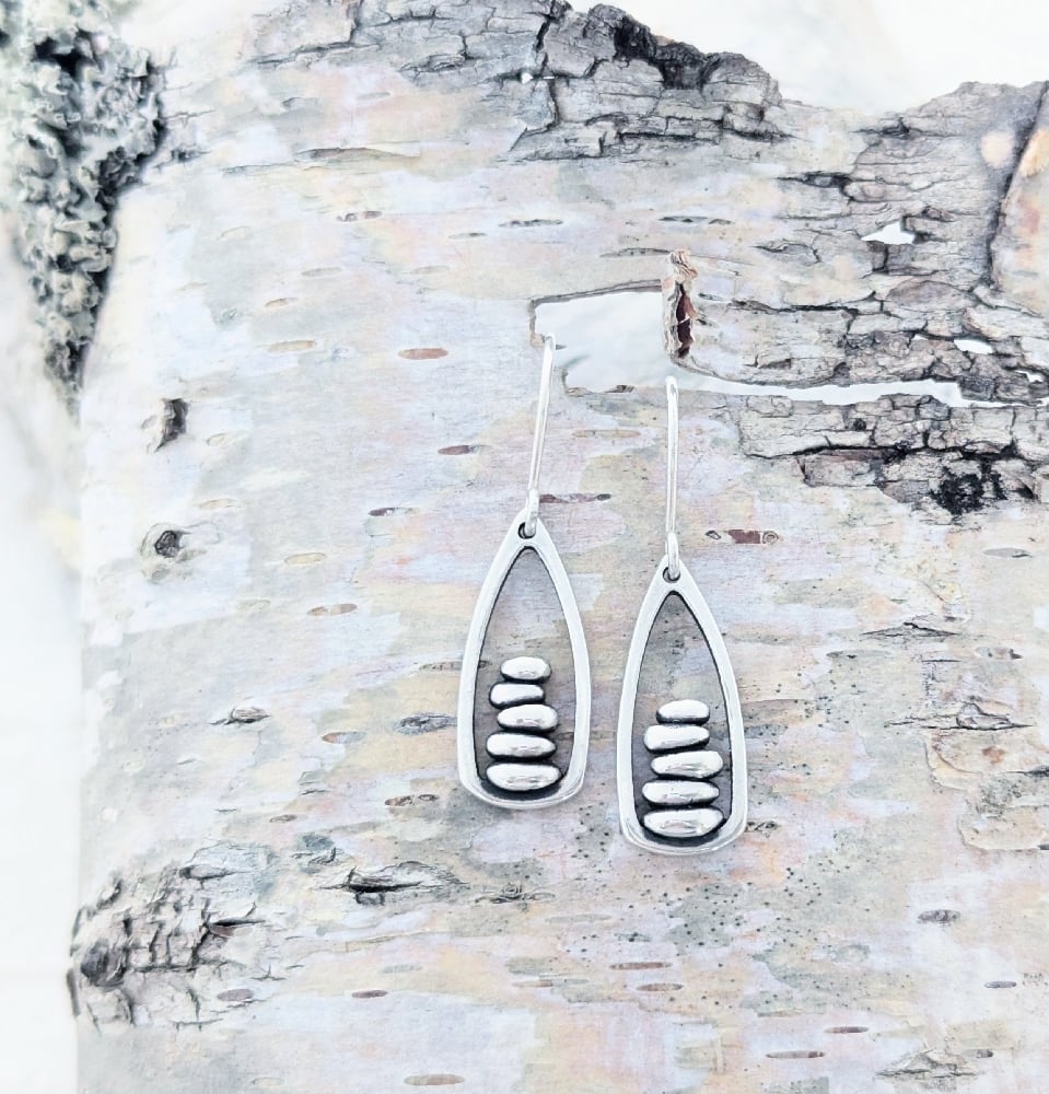 Inspired by the stacks of rocks on the trail that mark our way. "Stand tall, be centered, get grounded, guide others and if you fall...rebuild". Hand formed stacked stones in .999 fine silver. Earring 7/8“ x 7/16". Overall length with ear wires 1 1/2" long.
